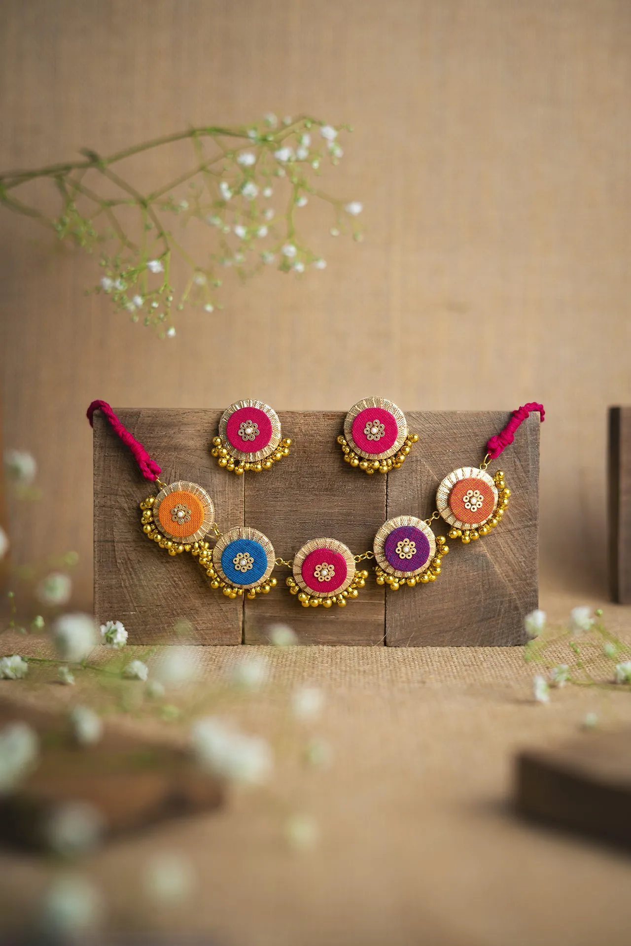 Traditional handmade necklace, showcasing colourful cotton fabric and intricate gotapatti work. Its unique blend of hues and techniques makes it a true piece of wearable art.